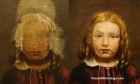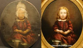 This small (10 inches high) portrait of a lovely little girl was painted in Maine in the late 1890's. It had a heavy layer of grime and darkened varnish, but the worst damage was caused by an old attempt at cleaning which partially removed the paint on her face and the background above. Careful cleaning revealed the basic outlines of the hair, eyes and nose, which were used as a guide in re-creating the face.