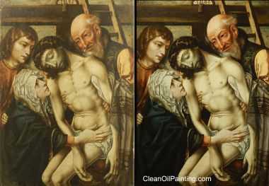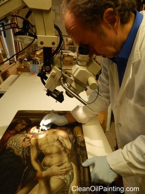 The far right photo shows the results after cleaning and varnishing with a non-yellowing, ultraviolet protecting archival varnish.