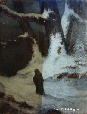 A mid-1800's winter scene by William Morris Hunt had been hanging over a fireplace mantel for a century. Here it is with the soot partially removed.